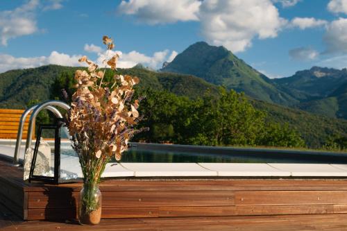 The apartment provides guests with a patio, mountain views, a seating area, satellite flat-screen TV, a fully equipped kitchen with a dishwasher and a microwave, and a private bathroom with bidet and a hair dryer. A toaster, a fridge and stovetop are also offered, as well as a coffee machine and a kettle. At the apartment complex, units are fitted with bed linen and towels.