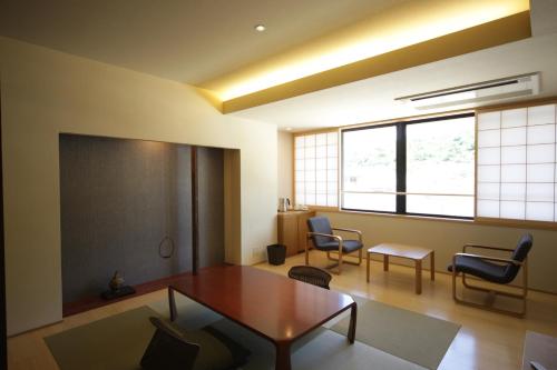 The top floor indoor and outdoor public baths overlook Setonaikai Sea and the Otorii Shrine Gate. The hotel also provides business services.