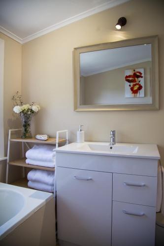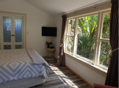 The ensuite studio has a lovely garden view from all windows. It contains a queen bed in a separate bedroom with a small separate lounge. A TV, coffee/tea and toiletries are provided.