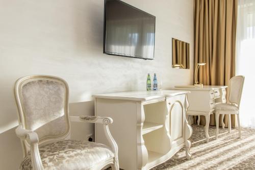 A very spacious suite with an LED TV, a seating area and a private bathroom. Complimentary bottle of mineral water is provided.