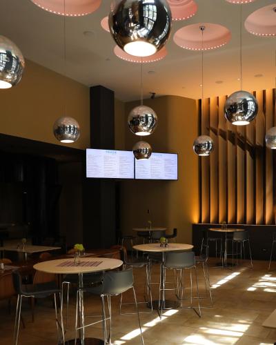 Offering on-site dining, Trace Restaurant and Bar features fresh local ingredients and a cocktail menu. The lobby features a three-story fireplace covered in nearly 1,000 stainless steel tiles and topped by a DJ booth as its centerpiece for music Friday and Saturday nights.